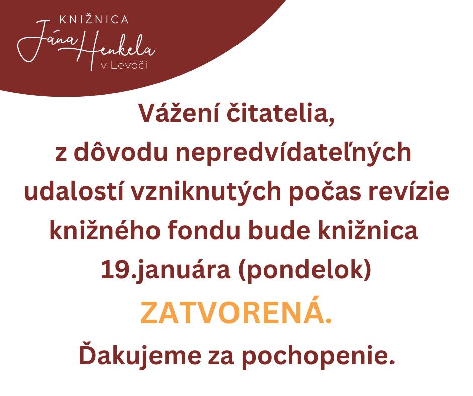 Milí čitatelia, z dôvodu povinnej revízie knižničného fondu bude knižnica od 1. 1. do 19. 1. 2026 ZATVORENÁ. Všetky výpožičky končiace počas doby zatvorenia knižnice vám budú automaticky predĺžené do 20. januára. Na nové knihy sa môžete tešiť od 1. februára. Ďakujeme za pochopenie a tešíme sa na stretnutia s vami v roku 2026!